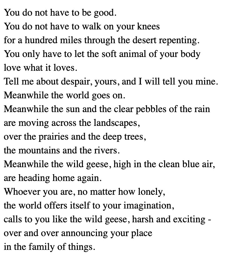 Sometimes I catch moments where the soft animal of my body (truly) is loving what it loves now. When the creaturely in me is satisfied and fed and sleepy and delighted to be in a body at all (not fighting it or wishing it away).